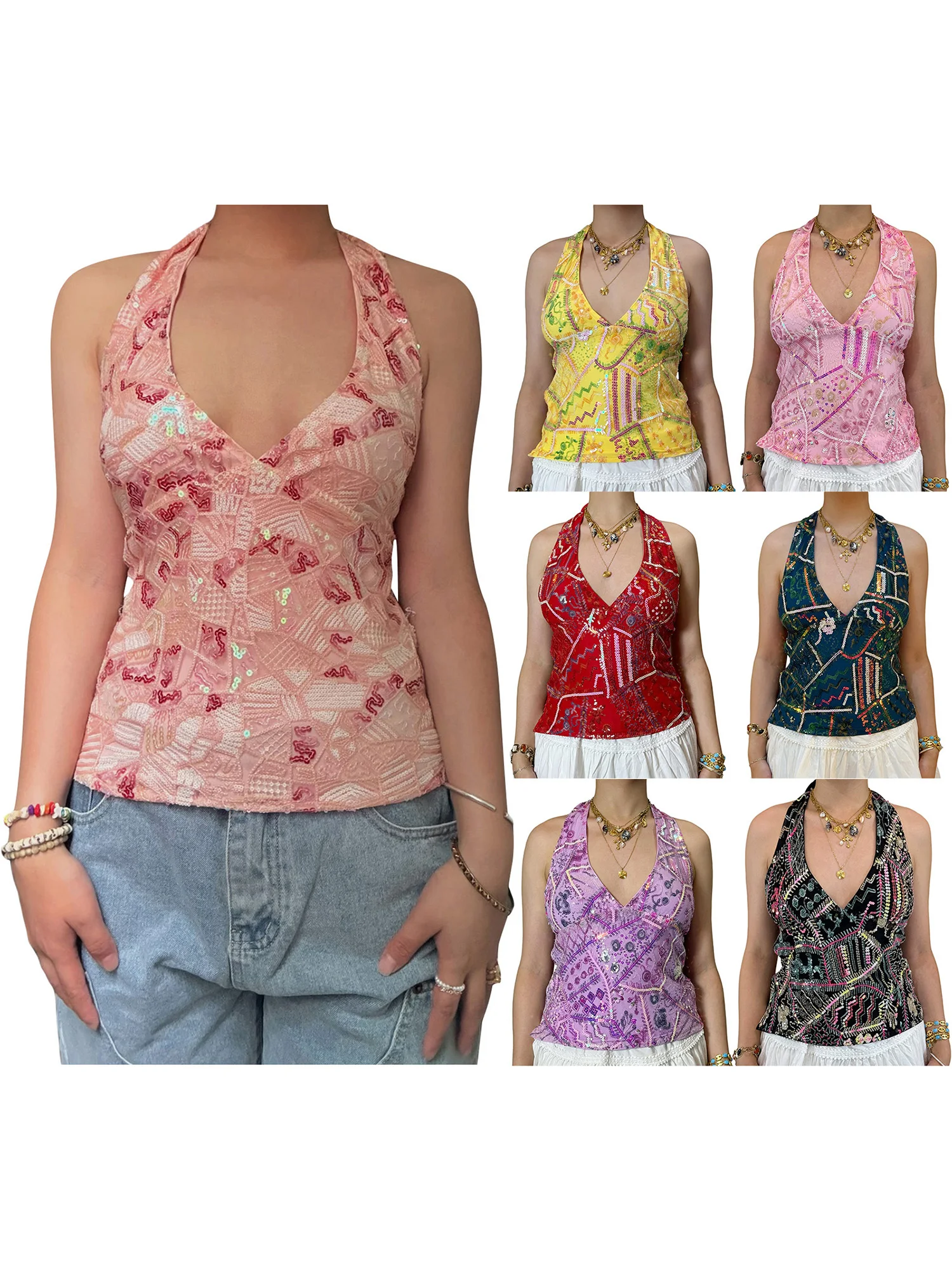 Women's Sequins Halter Tops Stylish Backless V Neck Sleeveless Fit Vest for Summer