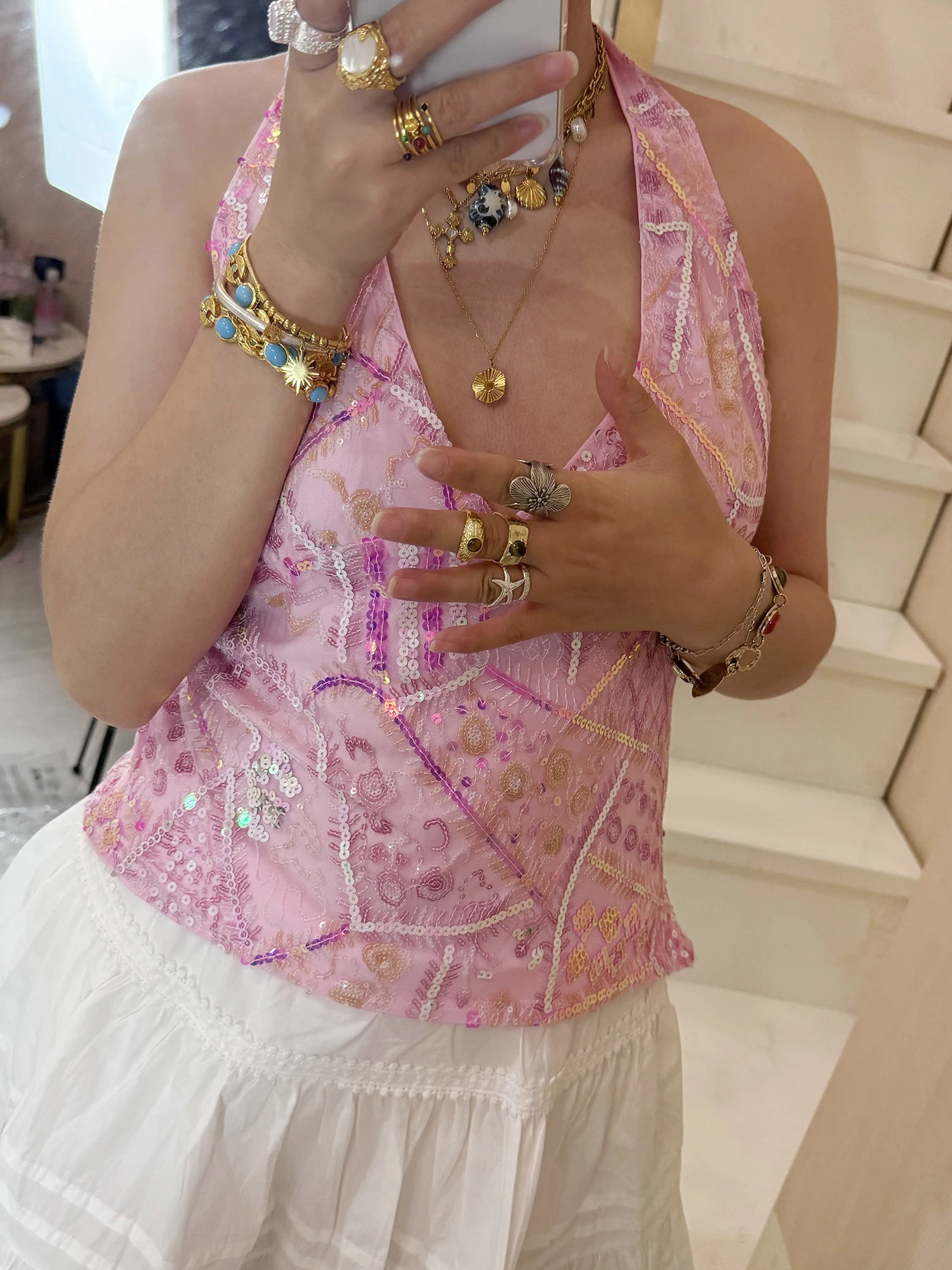Elegant Sequined Halter Neck Top with V-Neck and Sleeveless Design Perfect for Summer Parties and Events Flattering Fit