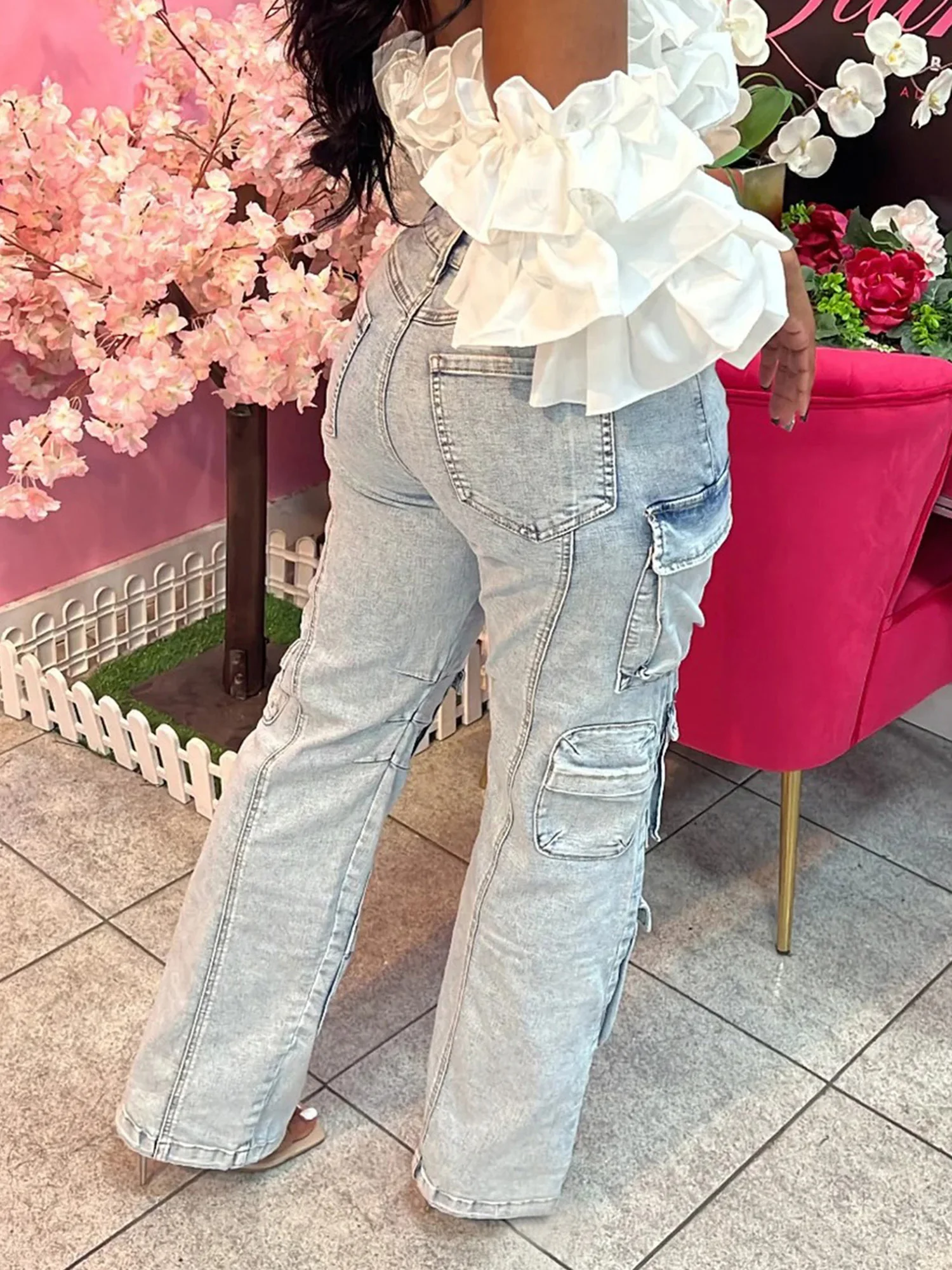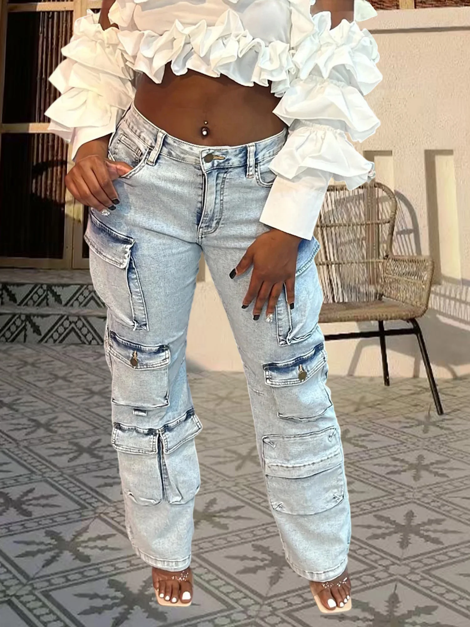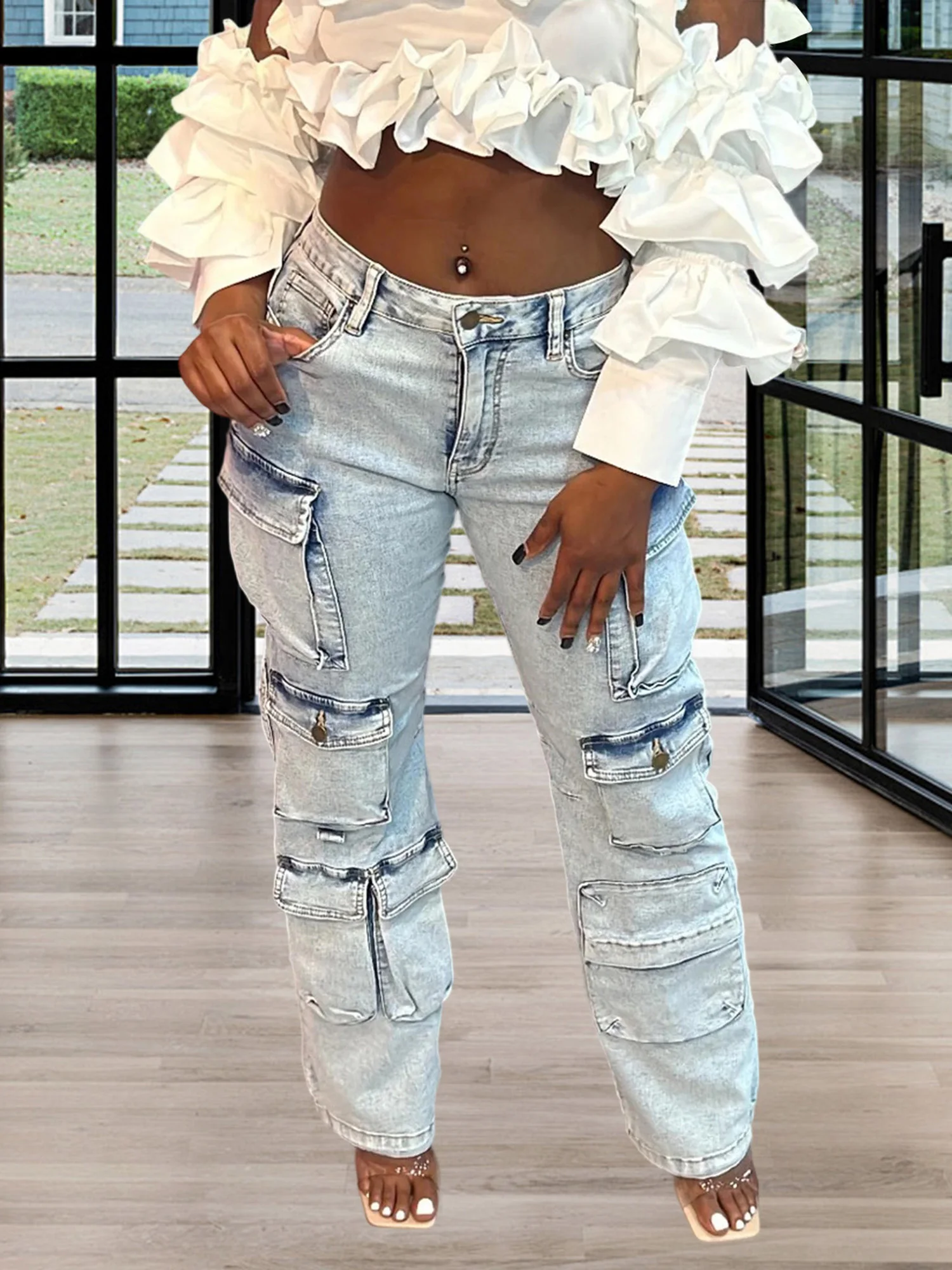 Ladies Classic Straight Leg Cargo Jeans with Mid Rise and Solid Color Denim - Stylish Casual Trousers for Everyday Wear