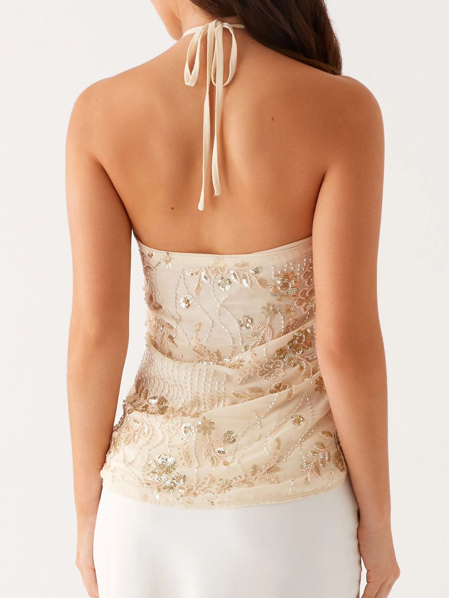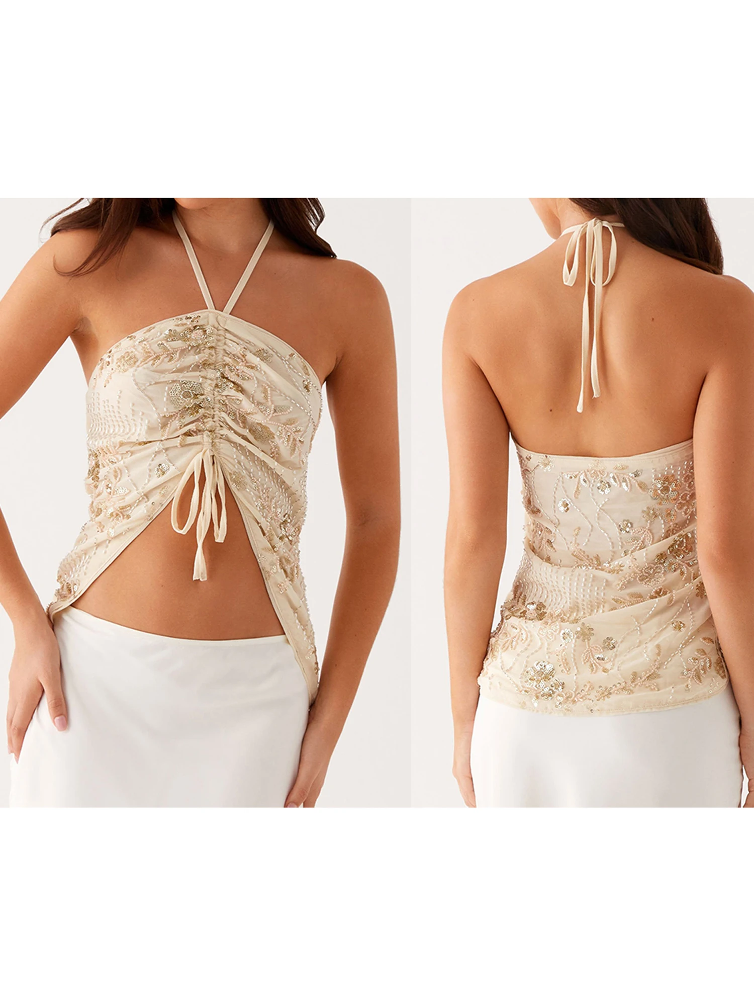 Sequin embroidery, drawstring hem, sleeveless, halter neck, bandage and backless, crop length; Backless halter top; Backless tops for women, versatile and fashionable, a must-have in your closet