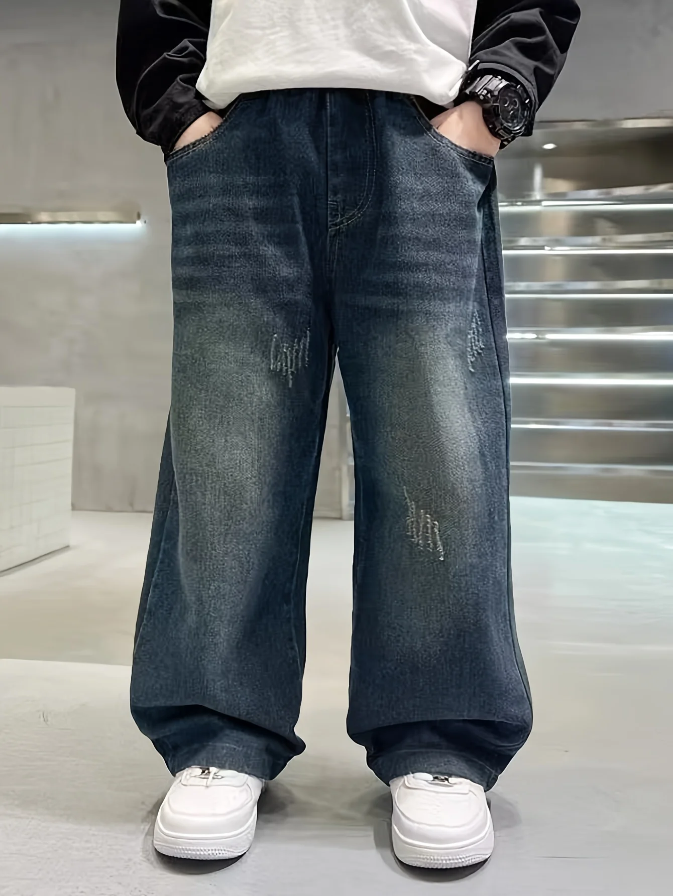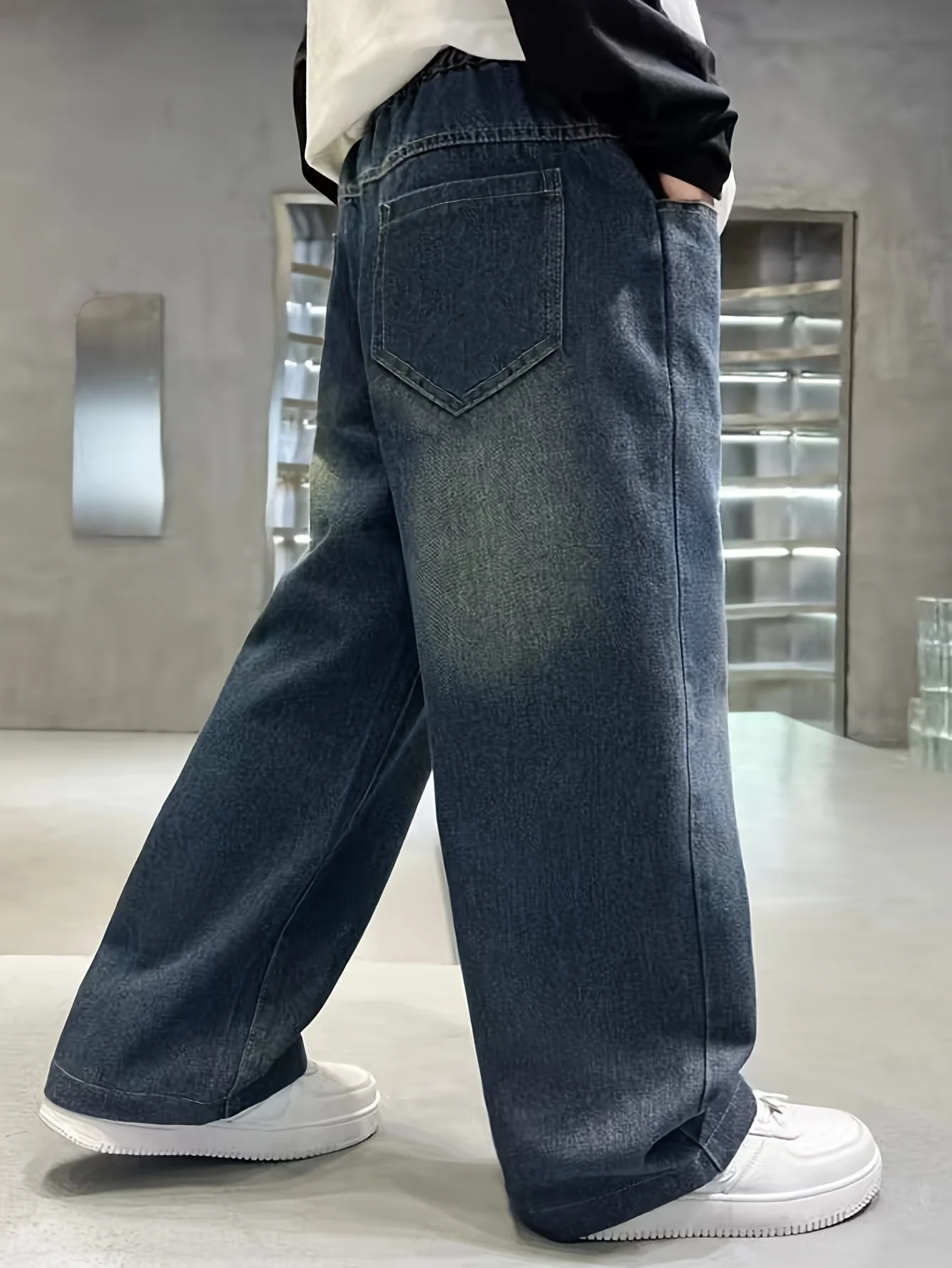 Vintage-washed gradient wide-leg straight-leg relaxed-fit preppy-style long denim jeans for teenage