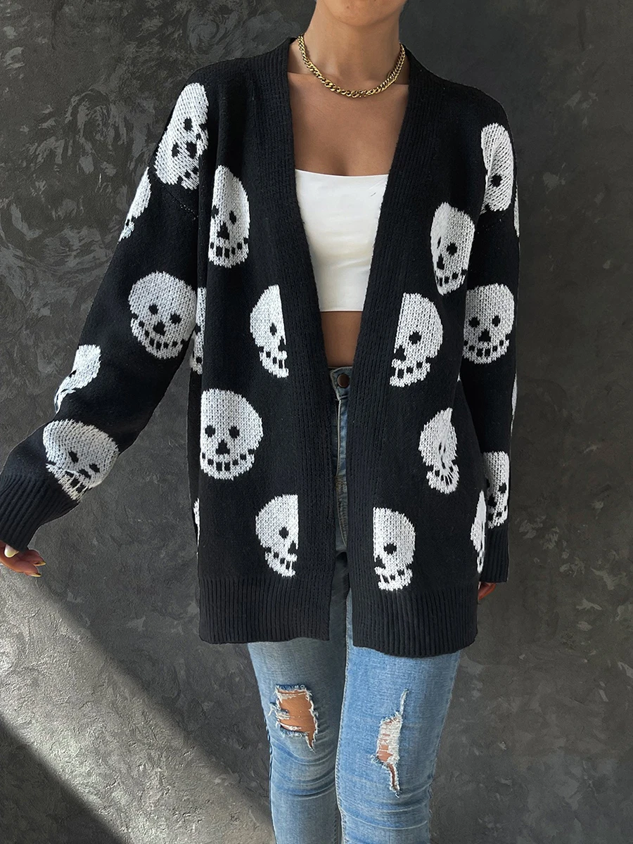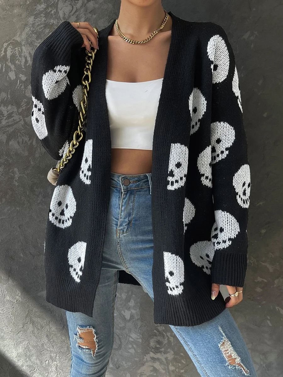 Women's Halloween Casual Knit Cardigan Long Sleeve Open Front Skull Print Knitwear Sweater